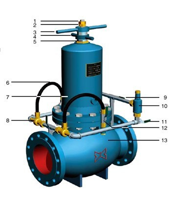如右圖所示,ZJY46H活塞式減壓閥是由主閥和反饋系統(tǒng)組成。圖中所示為功能代號(hào)④的產(chǎn)品:雙反饋??煞礇_排污、內(nèi)鎖定保護(hù)型。