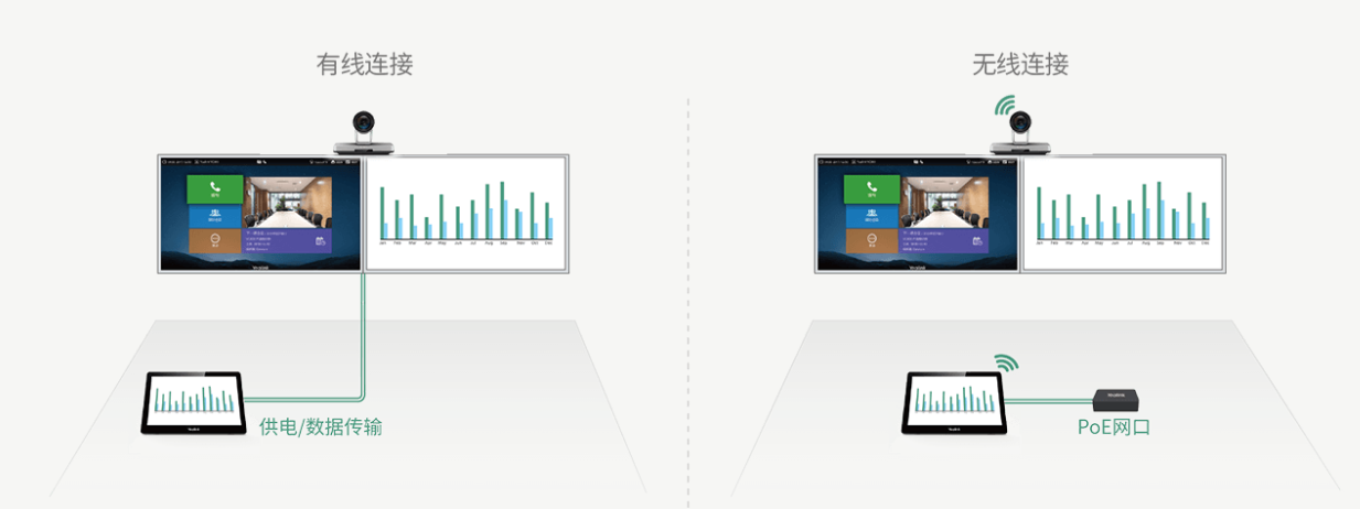 ·可采用Wi-Fi網(wǎng)絡與視頻會議主機完成連接,并通過PoE供電,免去電視區(qū)域與會議桌的布線困擾,輕松打造無線會議體驗